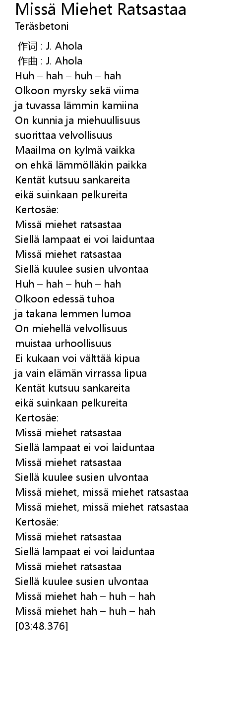 | [03:29.392] | Missä miehet hah – huh – hah |