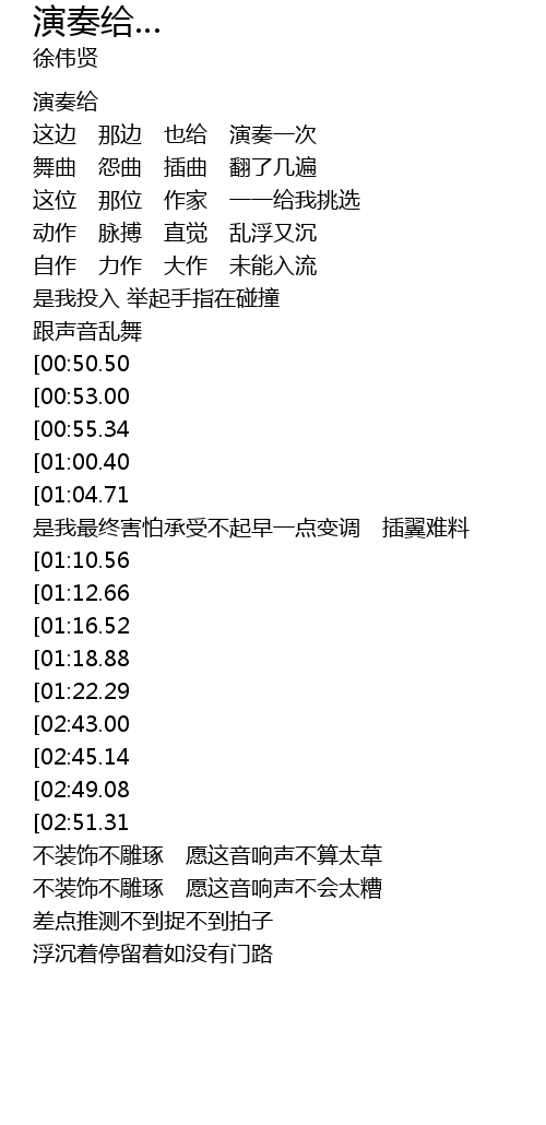 | [03:08.51][02:51.31][01:33.79] | 独奏未够尽情全放开全力去在这刻奏出 |