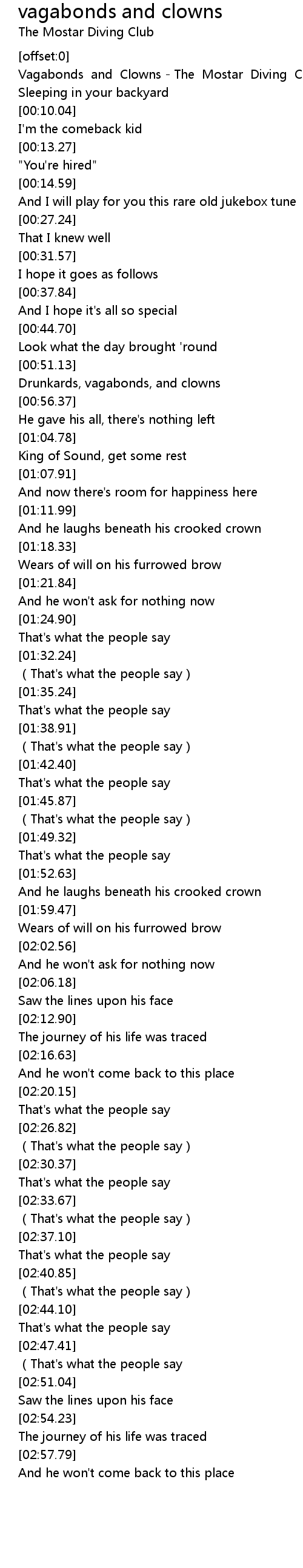 | [00:01.05] | Vagabonds and Clowns The Mostar Diving Club |