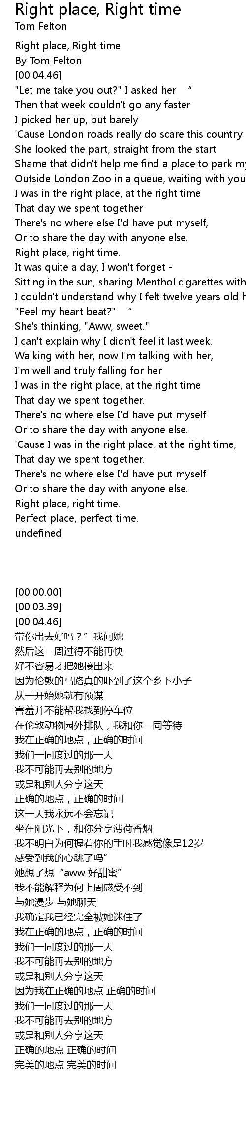 | [01:44.90] | ' Cause I was in the right place, at the right time, |
