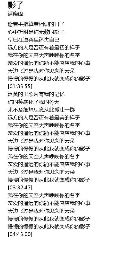 | [04:35.07] | màn màn de màn màn de cóng cǐ wǒ jiù biàn chéng nǐ de yǐng zi |