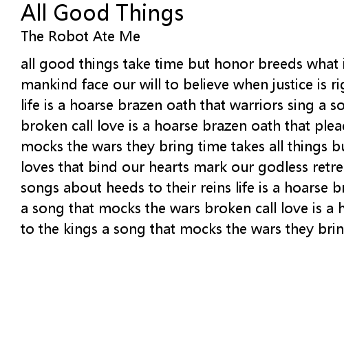 all good things take time but honor breeds what it brings the triumphs of mankind face our will to believe when justice is right it still wont set us free life is a hoarse brazen oath that warriors sing a song that mocks the wars broken call love is a hoarse brazen oath that pleads to the kings a sound that mocks the wars they bring time takes all things but it leaves what they bring loves that bind our hearts mark our godless retreat the chariots sing their songs about heeds to their reins life is a hoarse brazen oath that warriors sing a song that mocks the wars broken call love is a hoarse brazen oath that pleads to the kings a song that mocks the wars they bring |