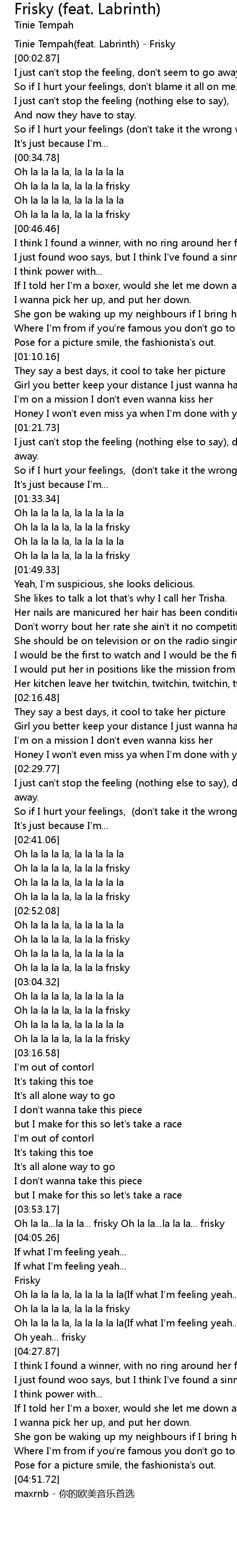 | [00:00.44] | Tinie Tempah(feat. Labrinth) - Frisky |
