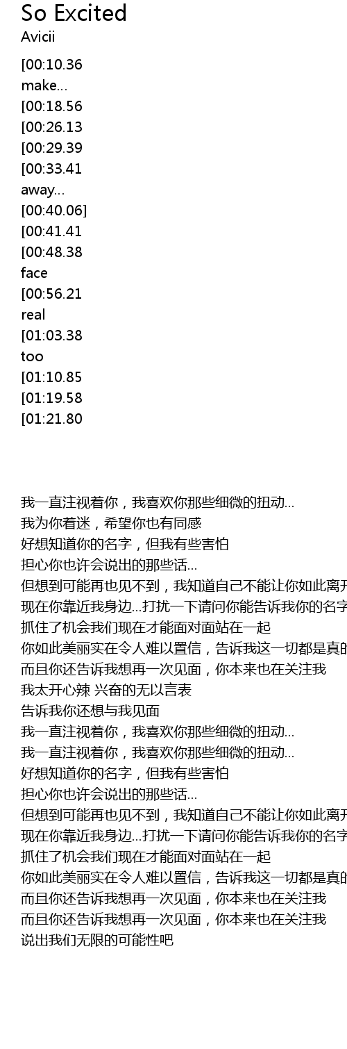| [02:50.52][01:10.85] | I' m so excited excited excited excited! |