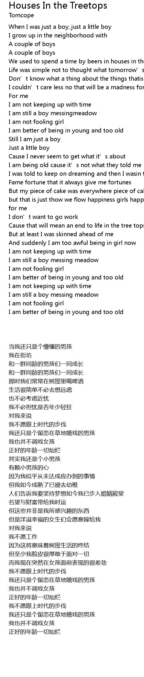 | [00:12.00] | We used to spend a time by beers in houses in the treetops |