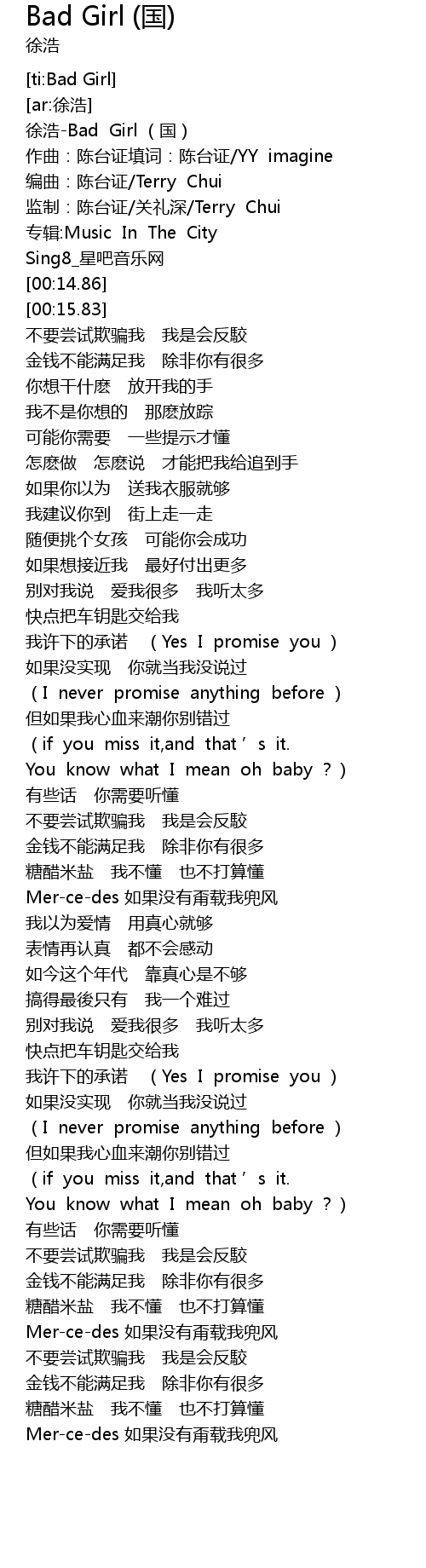 | [00:05.27] | 徐浩-Bad Girl (国) |