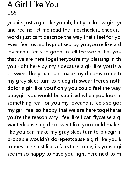 yeahits just a girl like youuh, but you know girl, you'll be on my mindsit back and recline, let me read the linescheck it, check it yall, whats up, comesimple words just cant describe the way that i feel for you babywhen i look into your eyesi feel just so hypnotised by youyou're like a dream come true to me, my loveand it feels so good to tell the world that you're my girli feel so happy that we are here togetheryou're my blessing in the skiesi thank the lord to have you right here by my sidecause a girl like you is all i ever wantedcause a girl so sweet like you could make my dreams come truecause a girl like you can make my gray skies turn to bluegirl i swear there's nothing that i probably wouldn't dofor a girl like youif only you could feel the way that i feel deep inside babygirl you would be suprised when you look in my eyes and feelthere's something real for you my loveand it feels so good to tell the world that you're my girli feel so happy that we are here togetherand im feeling butterfliesand you're the reason why i feel like i can flycause a girl like you is all i ever wantedcause a girl so sweet like you could make my dreams come truecause a girl like you can make my gray skies turn to bluegirl i swear there's nothing that i probable wouldn't dorepeatcause a girl like you is more than a dream come true to meyou're just like a fairytale scene, its youso girl just take my hand and see im so happy to have you right here next to me, you're so sweetchorus 3x |