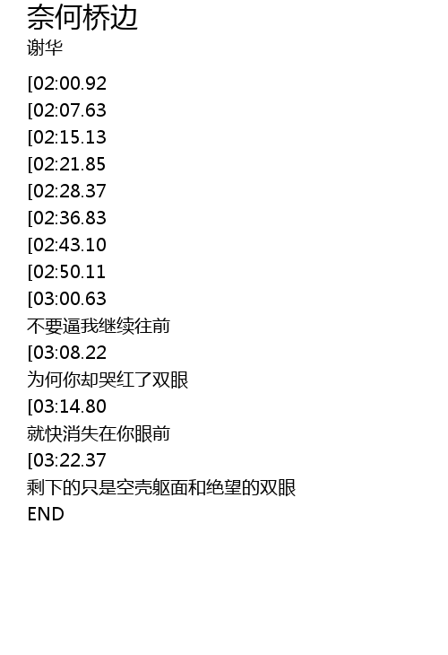 | [01:31.72][03:14.80][03:45.05] | 我已经踏上了奈何桥边 就快消失在你眼前 |