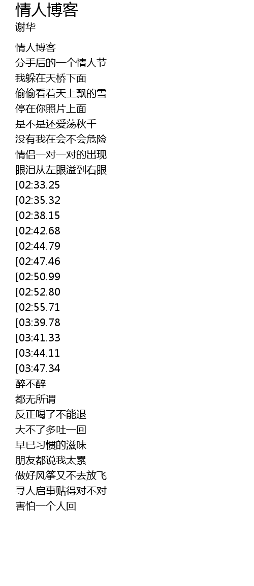 | [03:17.44][02:38.15][01:04.31] | 陪我过最后情人节 |
