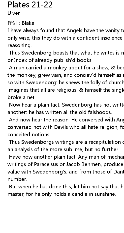 | Have now another plain fact. Any man of mechanical talents may, from the writings of Paracelsus or Jacob Behmen, produce ten thousand volumes of equal value with Swedenborg' s, and from those of Dante or Shakespear an infinite number. | |