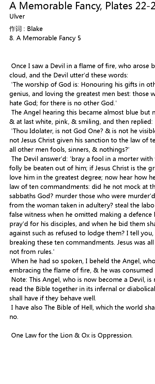 | Once I saw a Devil in a flame of fire, who arose before an Angel that sat on a cloud, and the Devil utter'd these words: | |