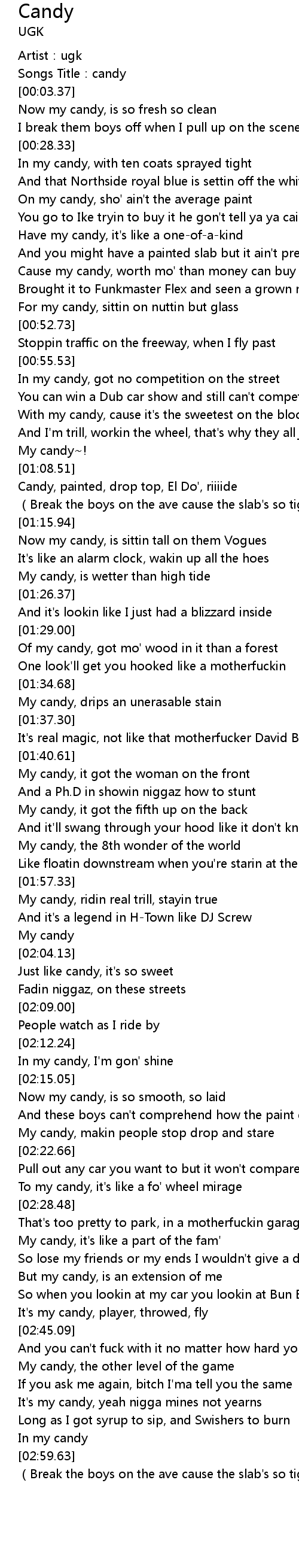 | [00:44.93] | Cause my candy, worth mo' than money can buy |
