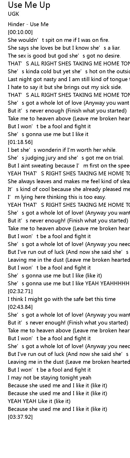 | [02:26.04] | She’s gonna use me but I like YEAH YEAHHHHHHHH! |