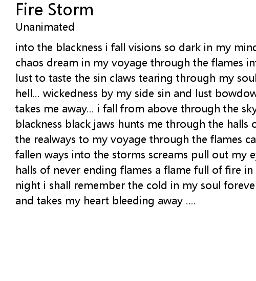 into the blackness i fall visions so dark in my mind they call chaos scream chaos dream in my voyage through the flames into my flesh they crawl emotional lust to taste the sin claws tearing through my soul i cried take me down to hell... wickedness by my side sin and lust bowdown before me storms of fire takes me away... i fall from above through the sky thrown away into the blackness black jaws hunts me through the halls of never ending pain in pain of the realways to my voyage through the flames calls of rise in my glaceless fallen ways into the storms screams pull out my eyes black roars hunts me to the halls of never ending flames a flame full of fire in a stillness but cold as night i shall remember the cold in my soul forever more as the storms screams and takes my heart bleeding away .... |