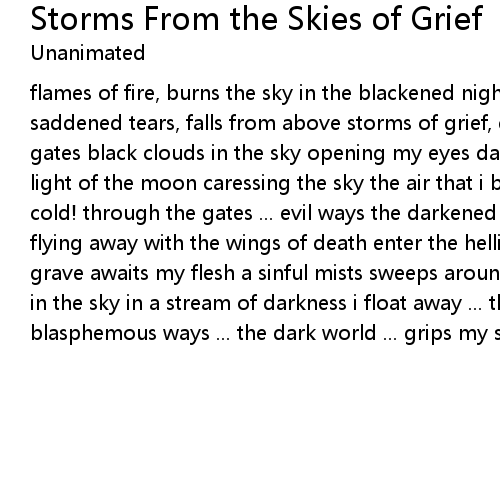 flames of fire, burns the sky in the blackened night, i hear the ancient cry saddened tears, falls from above storms of grief, embrace my soul through the gates black clouds in the sky opening my eyes dark reflections dancing before my light of the moon caressing the sky the air that i breathe is so cold ... so cold! through the gates ... evil ways the darkened world ... grips my soul flying away with the wings of death enter the hellish timeless regin blackened grave awaits my flesh a sinful mists sweeps around me moolight blazing like fire in the sky in a stream of darkness i float away ... through the gates ... blasphemous ways ... the dark world ... grips my soul through ... the gates |