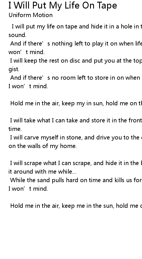 | I will put my life on tape and hide it in a hole in the ground, safe and sound. | |
