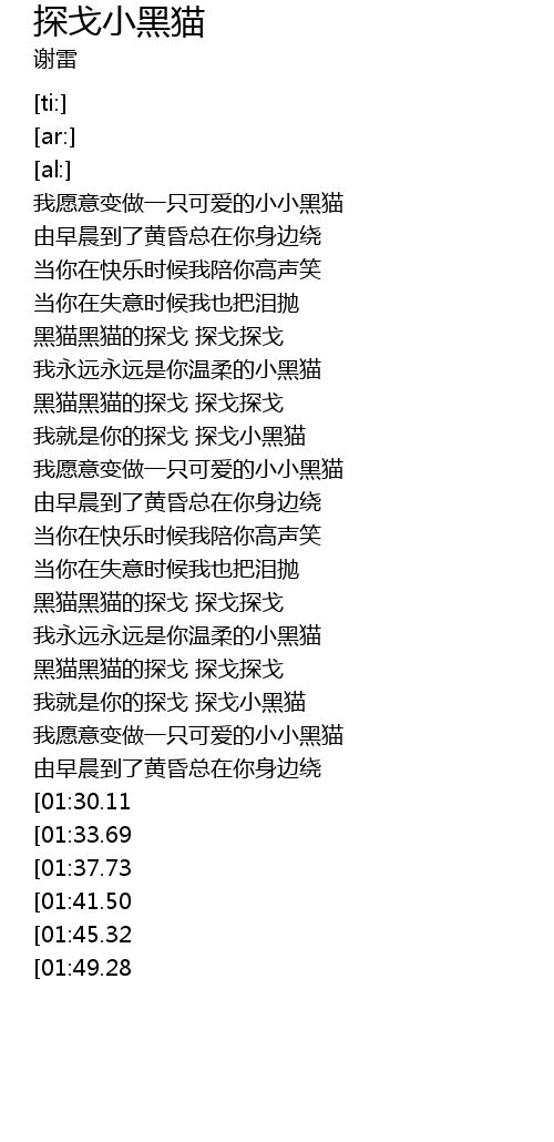 | [02:11.77][01:37.73] | hei mao hei mao de tan ge tan ge tan ge |