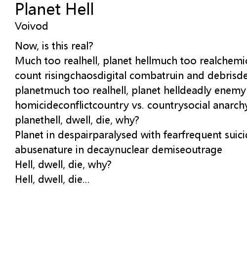 | Much too realhell, planet hellmuch too realchemical weaponsburning citizensbody count risingchaosdigital combatruin and debrisdecomposed bodiesrancid, planetmuch too realhell, planet helldeadly enemymurderous machinescountless homicideconflictcountry vs. countrysocial anarchydeconstruct orderanguish, planethell, dwell, die, why? | |