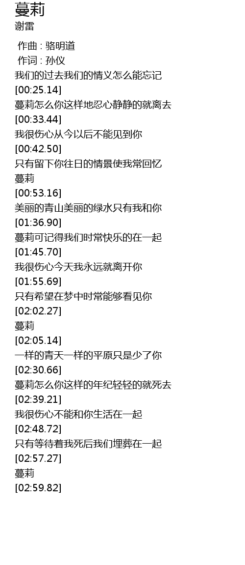 | [00:26.51] | 蔓莉怎么你这样地忍心静静的就离去 |