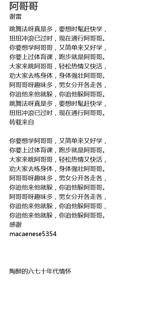 | 大家来跳阿哥哥,轻松热情又快活, | |