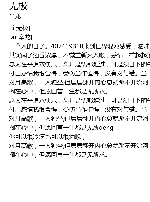 | [03:39.737] | 对月高歌,一人独坐,但层层翻开内心总就跳不开流河,在无极中脆弱,没有尽头悲欢离合, |