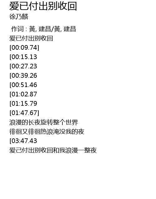 | [03:59.47][03:47.43][03:35.17] | ài yǐ fù chū bié shōu huí ài qǐng xiāng xìn bié hòu huǐ |