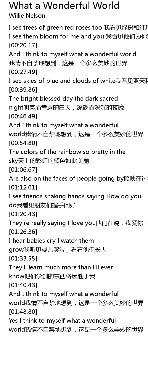 | [00:48.19] | And I think to myself what a wonderful world wo qing bu zi jin di xiang dao, zhe shi yi ge duo me mei miao de shi jie |