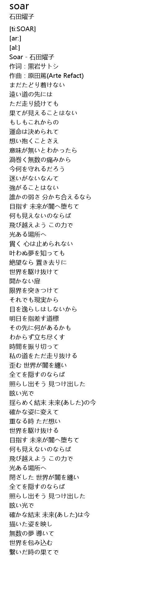 | [00:01.65] | Soar - 石田燿子 |