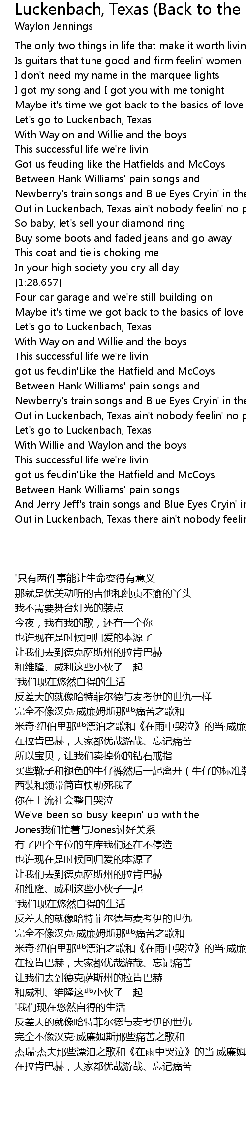 Out in Luckenbach, Texas there ain't nobody feelin' no pain |