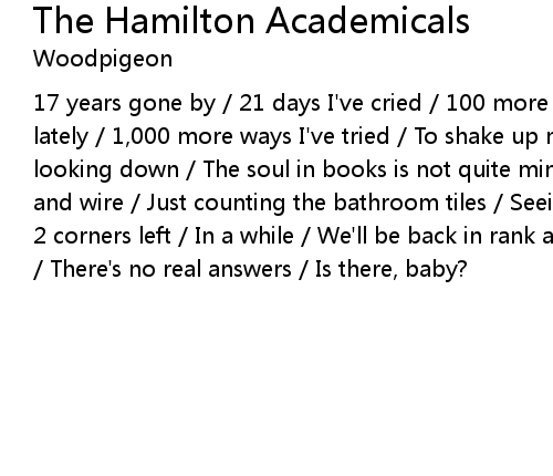 | 17 years gone by / 21 days I've cried / 100 more reasons why you wanted out and lately / 1,000 more ways I've tried / To shake up my old insides / My head's looking down / The soul in books is not quite mine / 850 miles / Borders of wood and wire / Just counting the bathroom tiles / Seeing faces, little smiles and / 2 corners left / In a while / We'll be back in rank and file / It doesn't add up / There's no real answers / Is there, baby? |
