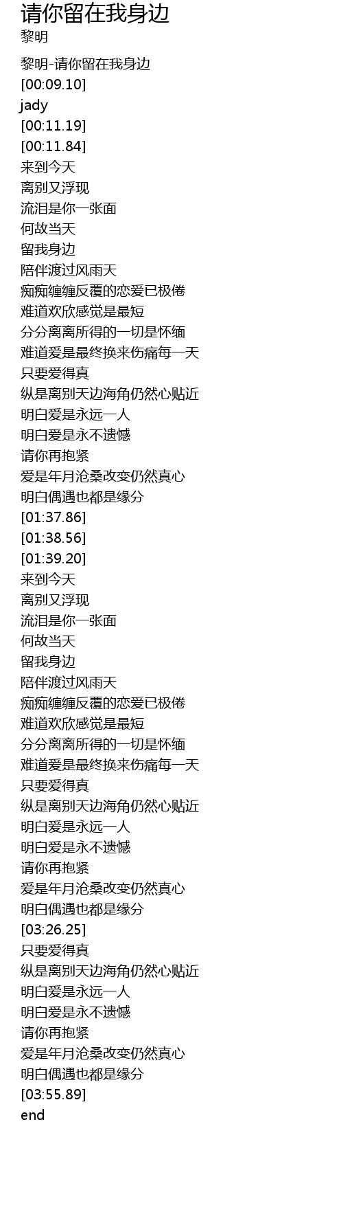 | [00:03.13] | lí míng qǐng nǐ liú zài wǒ shēn biān |