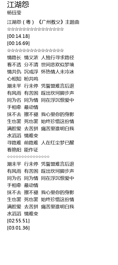 | [00:02.48] | 江湖怨(粤) 《广州教父》主题曲 |