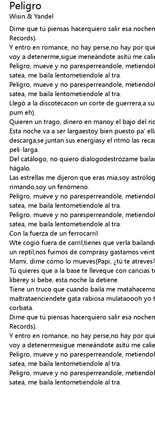 | Peligro, mueve y no paresperreandole, metiendole al tra (ooeeh oeeh)ella me satea, me baila lentometiendole al tra. |