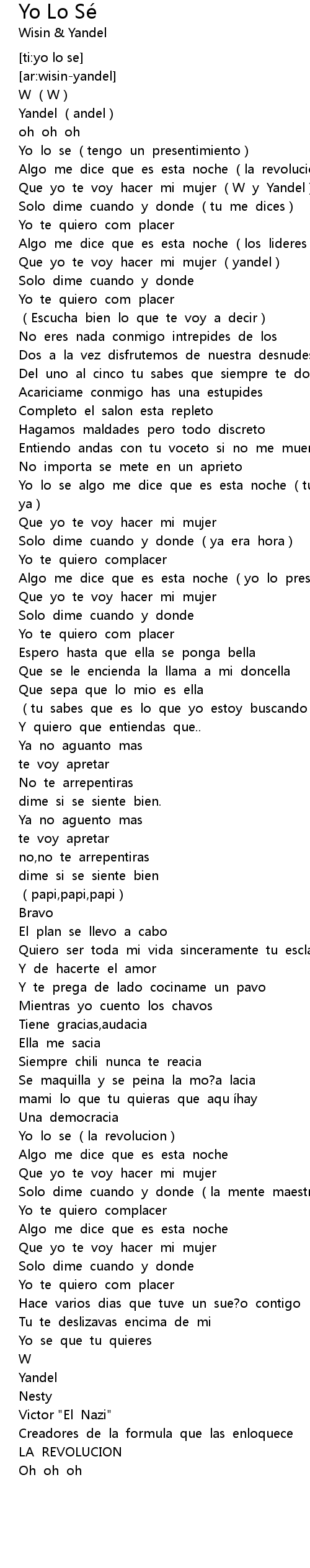 | [00:12.23] | Que yo te voy hacer mi mujer (W y Yandel) |