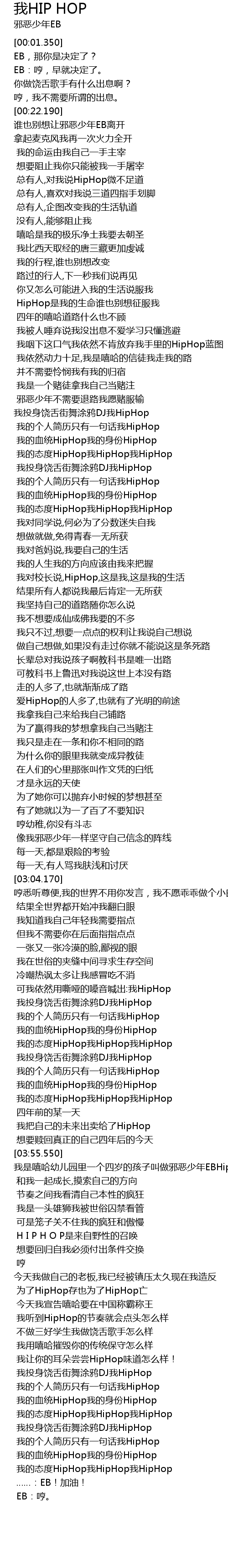 | [03:55.550] | 我是嘻哈幼儿园里一个四岁的孩子叫做邪恶少年EBHipHop |