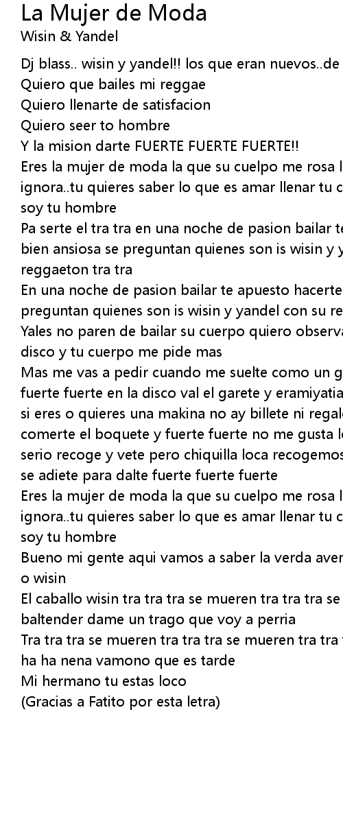 Mas me vas a pedir cuando me suelte como un gaete y en la cama tejuntonikete y fuerte fuerte en la disco val el garete y eramiyatia coete me pitan un vankete y si eres o quieres una makina no ay billete ni regalo braceletes solo quiero comerte el boquete y fuerte fuerte no me gusta los grilletes si quieres algo serio recoge y vete pero chiquilla loca recogemos vetes me regresa cuando wisin se adiete para dalte fuerte fuerte fuerte |
