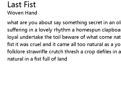 | what are you about say something secret in an old order hush trouble and suffering in a lovely rhythm a homespun clapboard blackstrap thrush devoted loyal undertake the toil beware of what come natural undertake the spoil in a fist it was cruel and it came all too natural as a younger child a headstrong folklore strawrifle crutch thresh a crop defiles in a fist full of sand it came natural in a fist full of land |