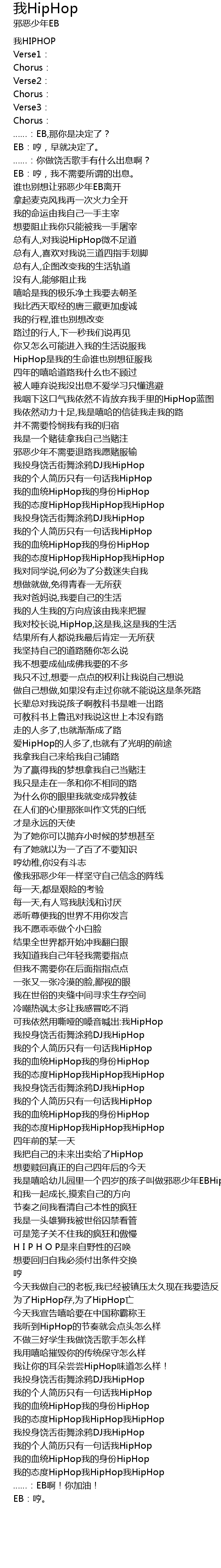 | [03:55.53] | 我是嘻哈幼儿园里一个四岁的孩子叫做邪恶少年EBHipHop |