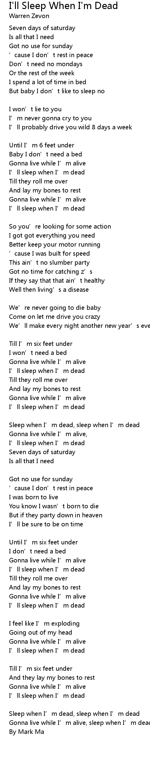 | Sleep when I' m dead, sleep when I' m dead | |