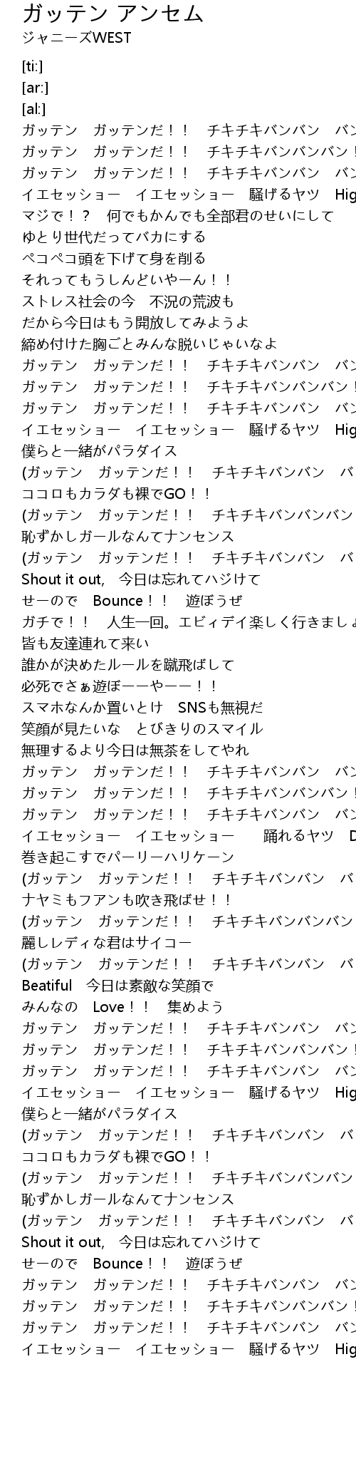 | [01:09.00] | イエセッショー イエセッショー 騒げるヤツ High!! |