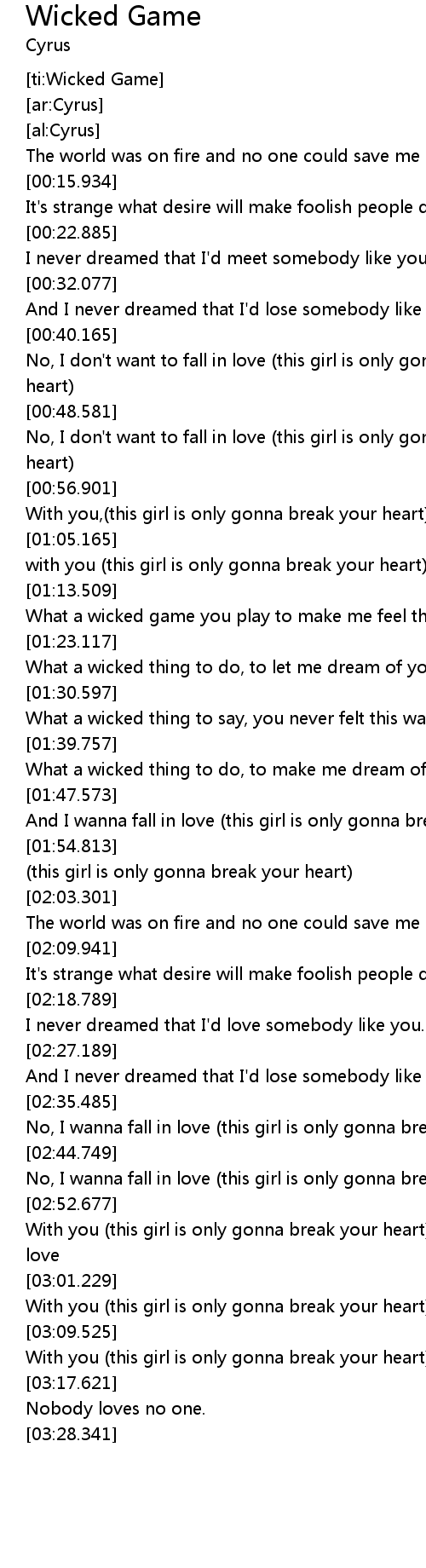 | [01:13.773] | What a wicked game you play to make me feel this way. |