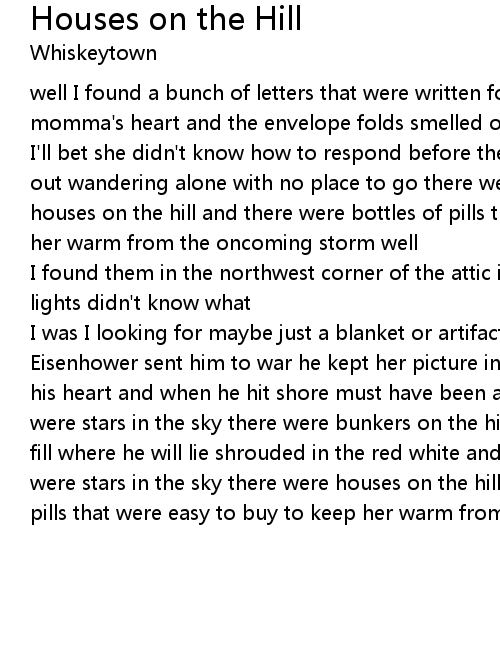 Eisenhower sent him to war he kept her picture in his pocket that was closest to his heart and when he hit shore must have been a target for the gunman there were stars in the sky there were bunkers on the hill and there were caskets to fill where he will lie shrouded in the red white and blue with the stripes there were stars in the sky there were houses on the hill and there were bottles of pills that were easy to buy to keep her warm from the oncoming storm |