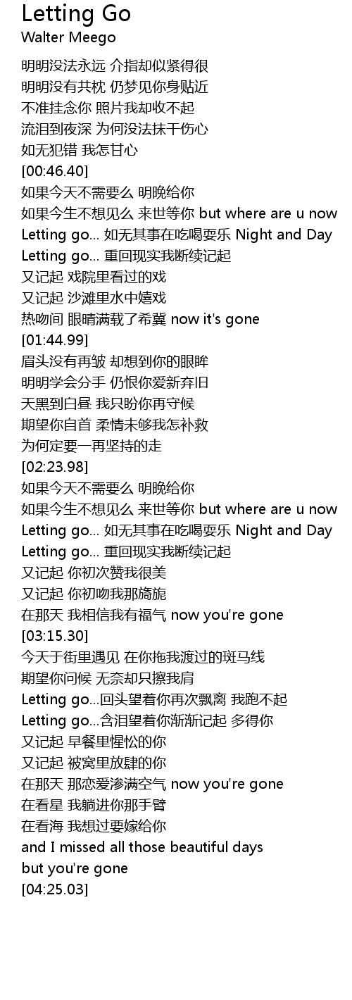 | [03:40.10] | Letting go...含泪望着你渐渐记起 多得你 |