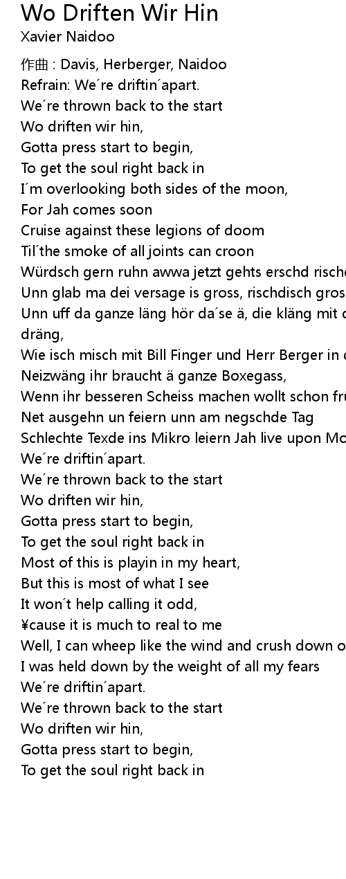 | Unn uff da ganze l ng h r da se , die kl ng mit denn isch uff die strosse dr ng, | |
