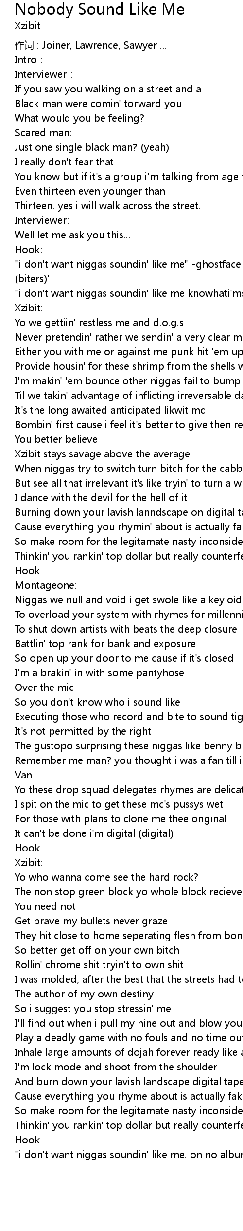 | "i don't want niggas soundin' like me knowhati'msayin'?" (x2) | |