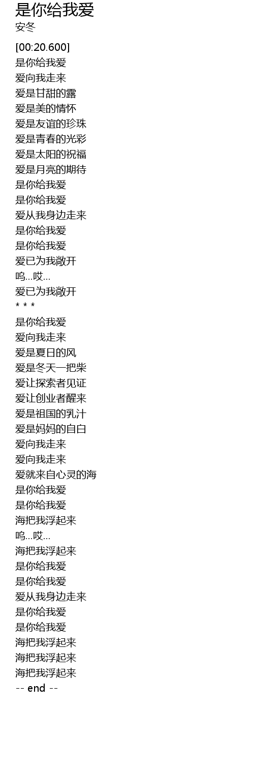 | [00:22.600] | shì nǐ gěi wǒ ài |