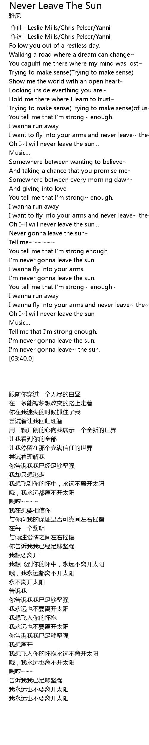 | [03:03.790] | I wanna fly into your arms and never leave~ the~ sun~ |