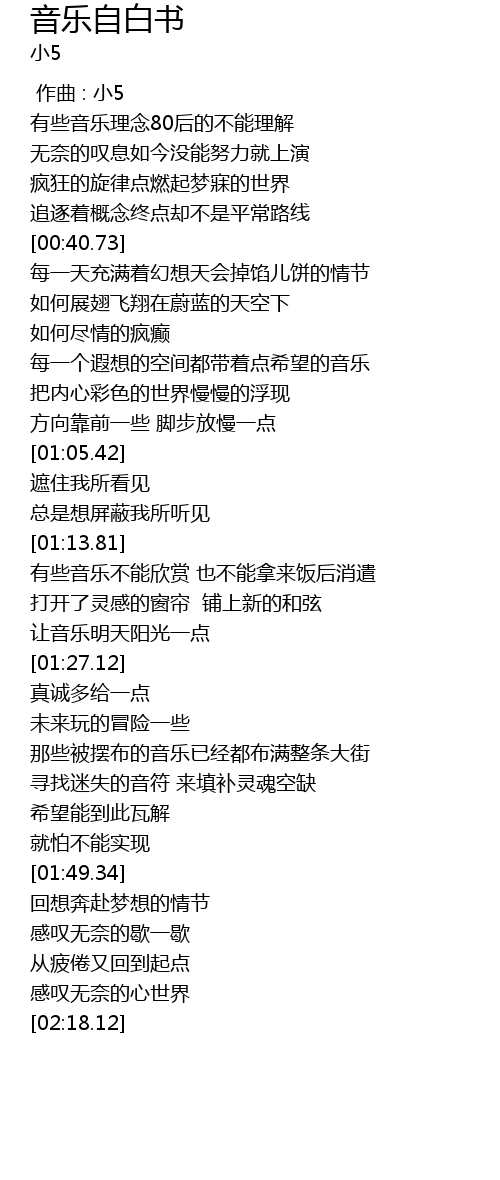 | [00:00.00] | zuò qǔ : xiǎo 5 |