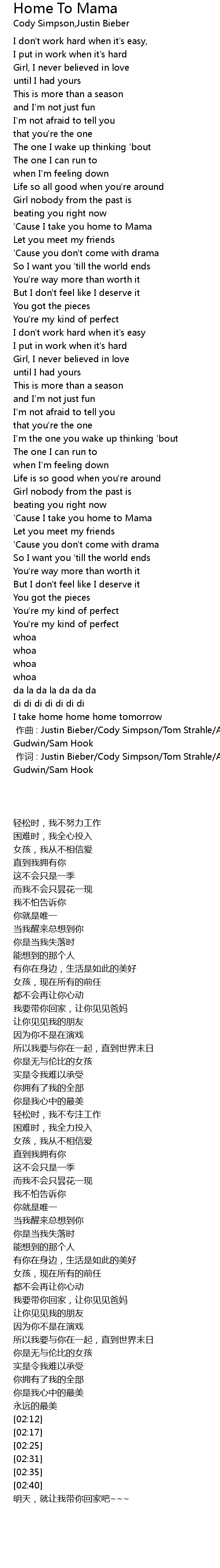 | [01:46] | 'Cause I take you home to Mama |