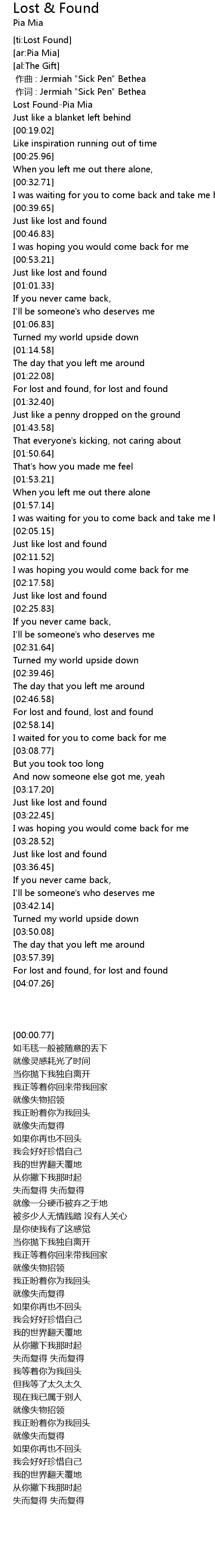 | [00:00.77] | Lost FoundPia Mia |